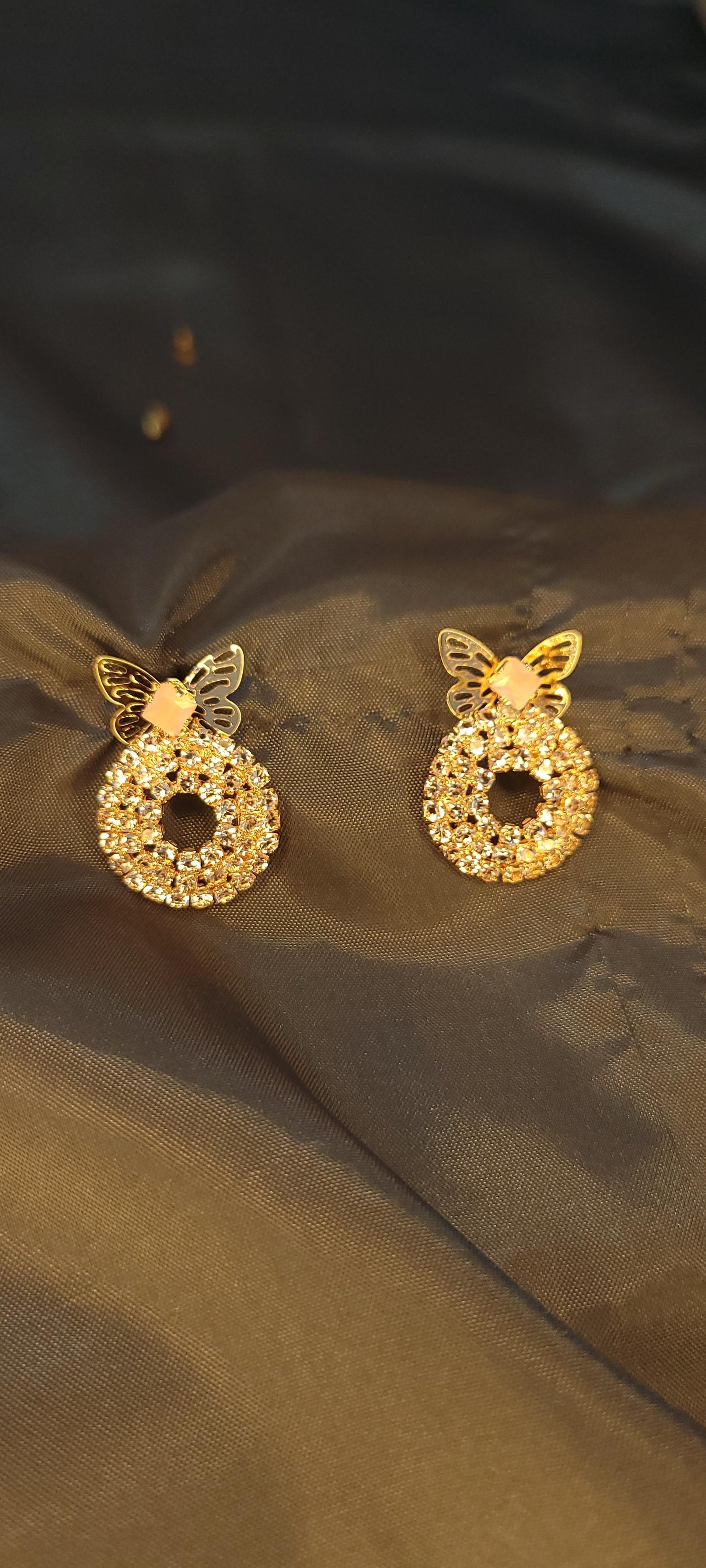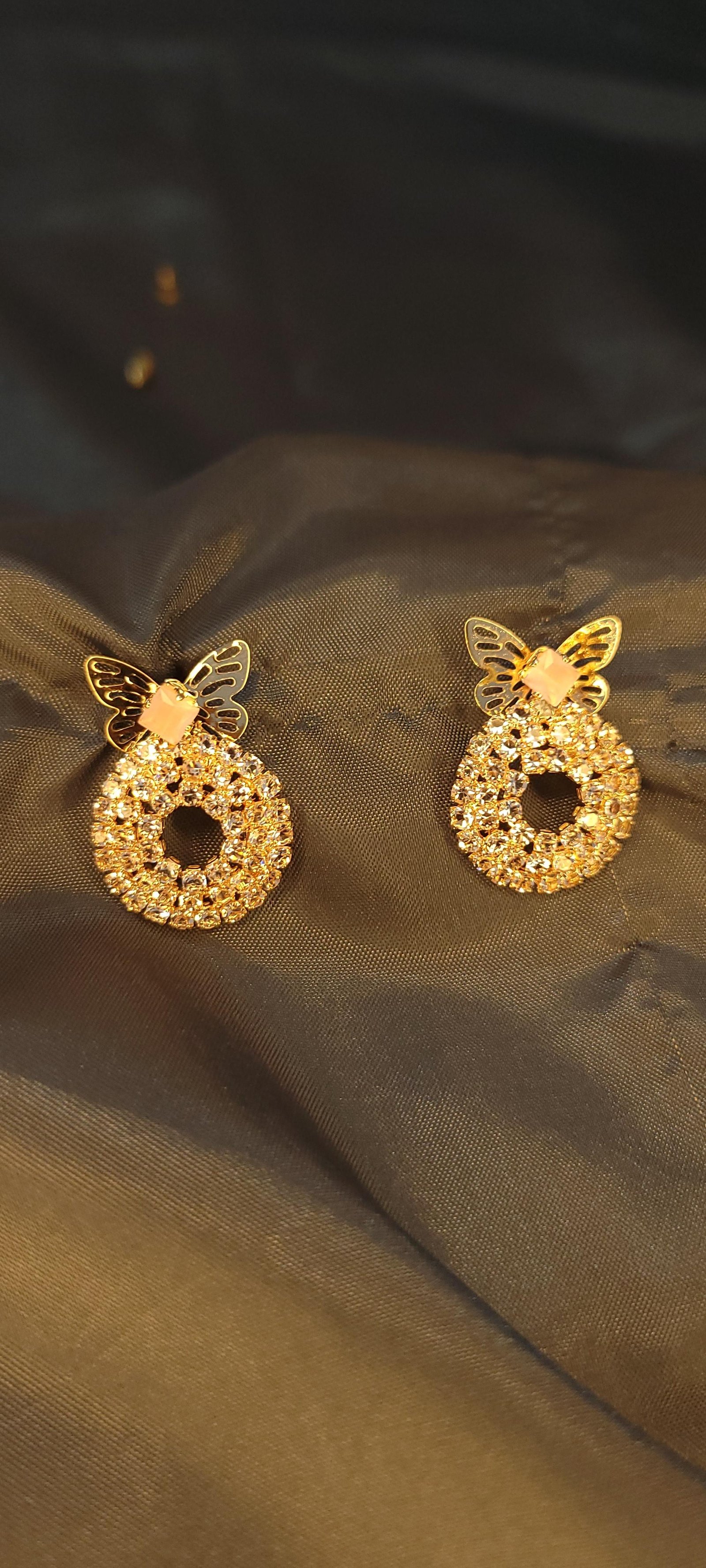 The Blush Radiance Earrings feature a delicate butterfly design with a gold-plated finish and sparkling clear crystals. The unique circular shape, adorned with shimmering stones, gives these earrings a sophisticated and radiant look, perfect for both casual wear and special occasions.